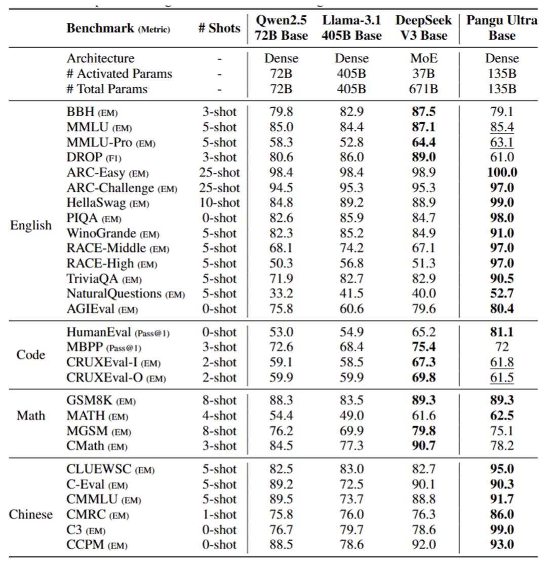 Pangu Ultra Base 测评结果,粗体表明最好结果,下划线表明该模型在 dense 中最好