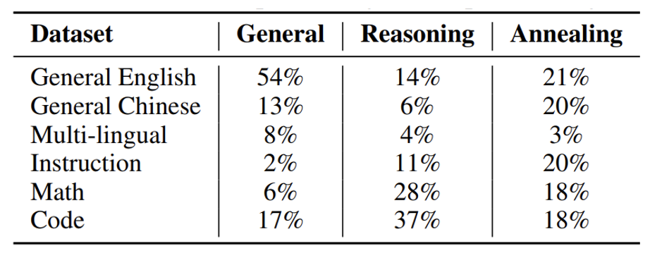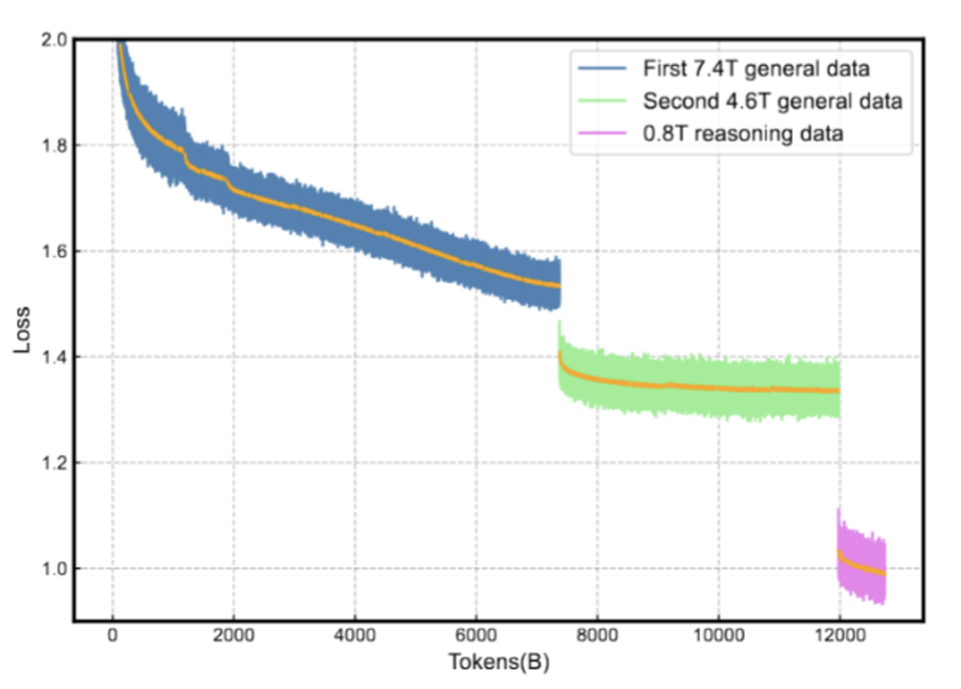 通用阶段(12T)旨在帮助模型积累知识和语言表达能力,推理阶段(0.8T)旨在强化模型推理技能,而退火阶段(0.4T)则进一步教会模型如何运用已学到的知识和推理技能。