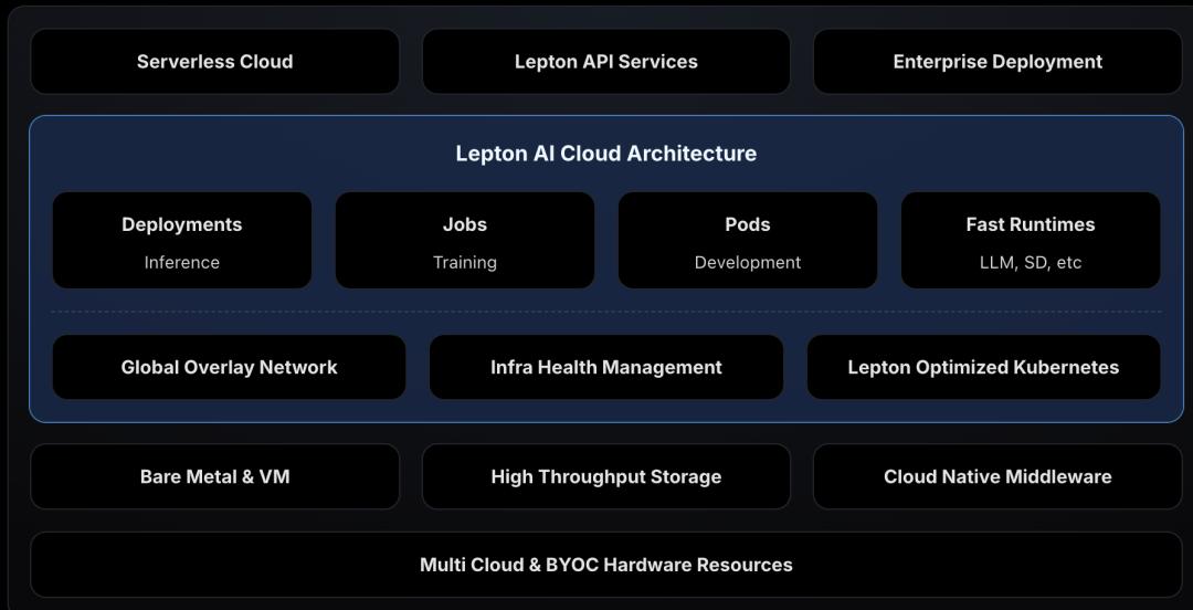 全托管的 AI 云平台 Lepton:支持模型的开发、训练和部署,包括开箱即用的 Serverless 接口,兼容 OpenAI API;完全自定义的专属推理接口;支持运行分布式训练或批处理作业等。