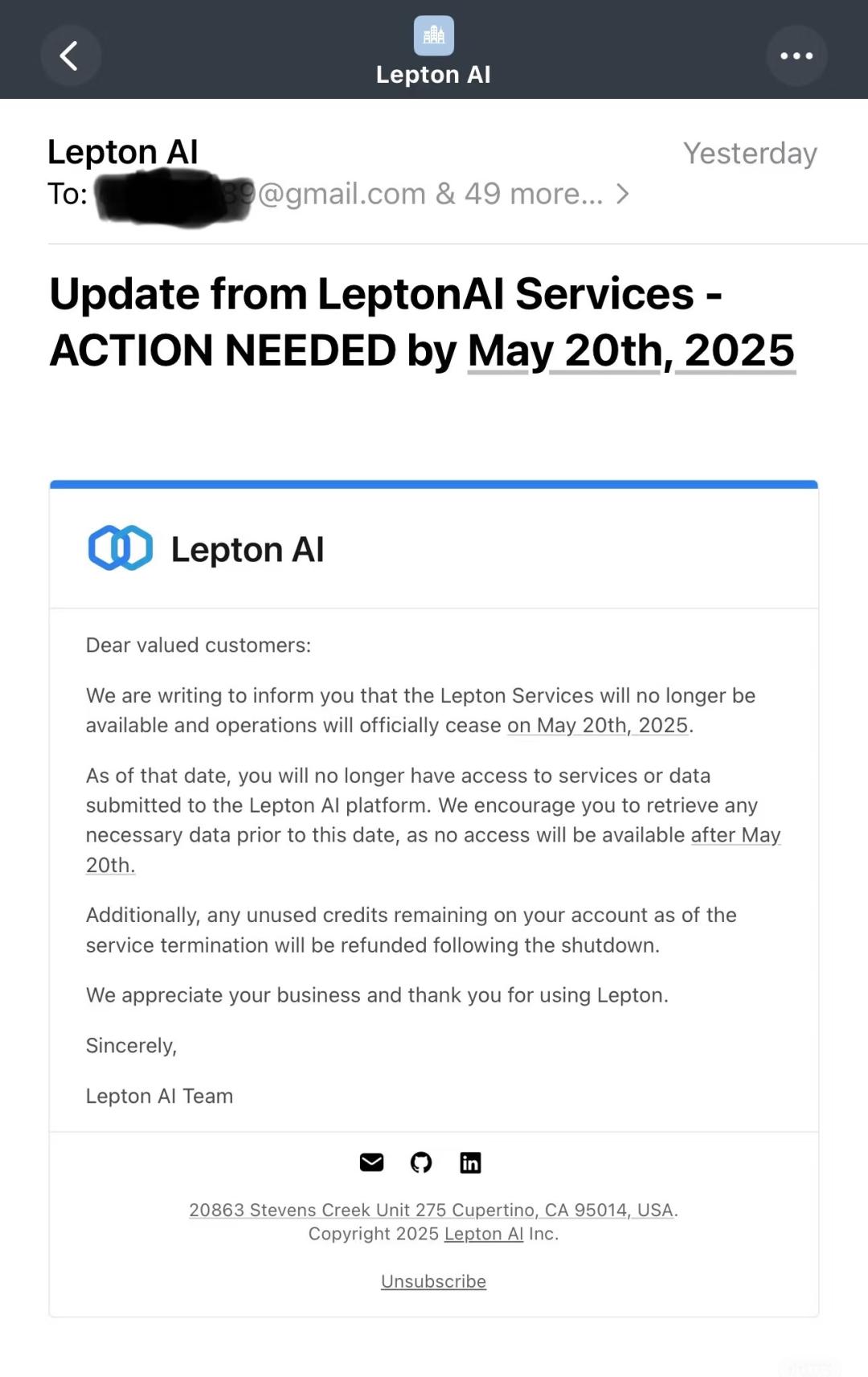 近日,网上曝出 Lepton AI 已通知用户,Lepton 将于 2025 年 5 月 20 日正式停止运营,此后用户将无法再访问 Lepton AI 平台上的服务或提交的数据,建议用户在该日期之前尽快下载或备份所需数据。服务终止时,若用户账户中仍有未使用的积分,官方将会在关停后予以退款处理。