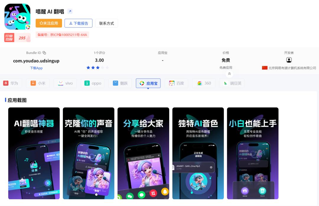 值得注意的是,点点数据显示,《唱醒AI翻唱》APP于2024年10月上线App Store,至2025年2月27日更新1.3.1版本后,至今再无新版本更新。同时,其于2025年3月6日上线应用宝,推出安卓客户端,之后至今同样再无更新,也未在华为、小米等其他安卓端应用商店上线。