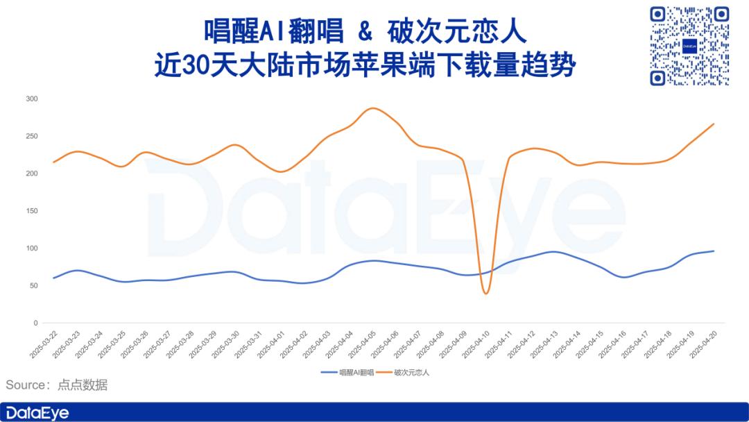 《破次元恋人》与《Hi Echo》下载量接近,近30天下载量多保持在200次以上,仅有4月10日出现短暂低谷;《唱醒AI翻唱》下载量为这四款应用中最低,日下载量均不足100次。