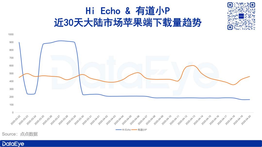 点点数据显示,下载量方面,近30天《有道小P》表现稳定,日下载量始终维持在450组左右,而《Hi Echo》在2月份下载量相对较高,多日保持在900次左右,而后迅速下滑,日下载量保持在200组左右。