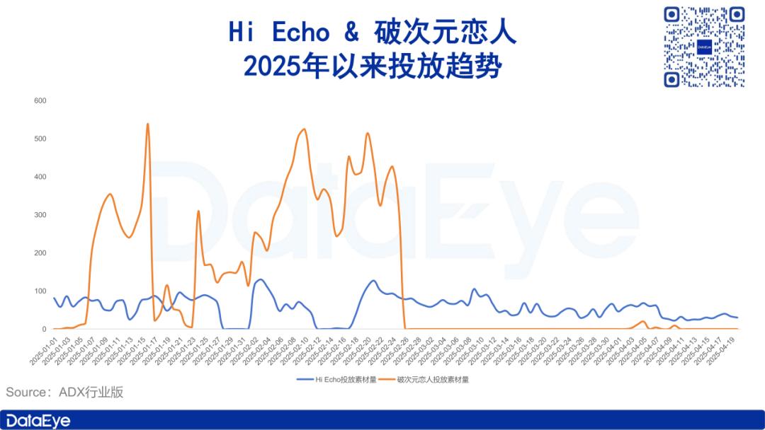 《破次元恋人》投放自1月3日开始,至2月底整体投放力度较《Hi Echo》偏高,日投放素材量峰值超500条,不过2月底之后,《破次元恋人》停止投放,除4月初有极少量素材外,整体投放力度接近停滞状态。
