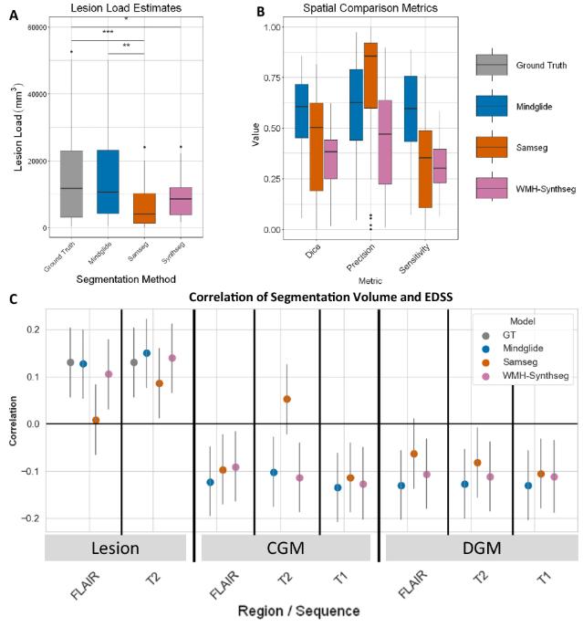 首先,实验比较了三者与人类专家标记病变分割与残疾的一致性情况,如下图所示。MindGlide 与人工标记的真实病变之间的一致程度更高,中位数 Dice 得分为 0.606,SAMSEG 为 0.504,WMH-Synthseg 为 0.385。