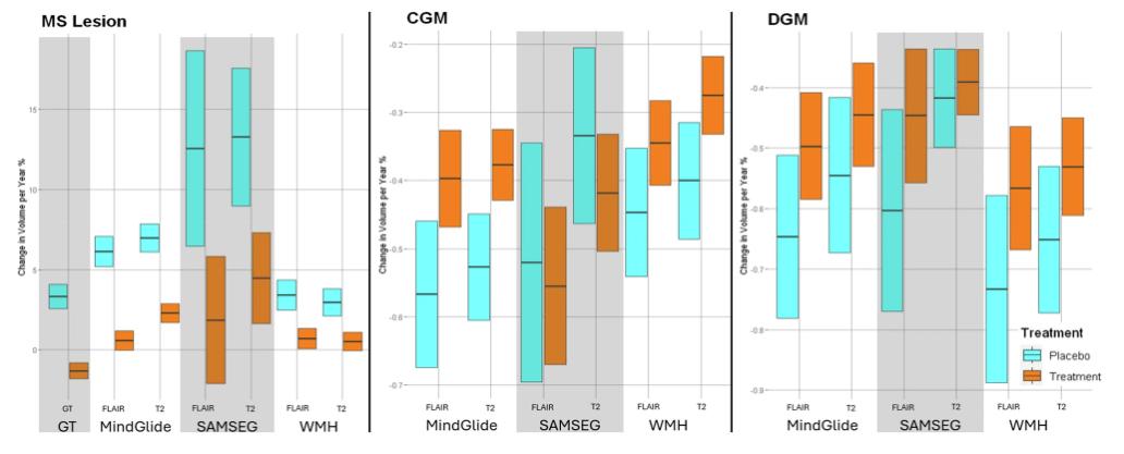 下图显示了三者对区域脑容量的评估,结果显示,与纵向 SAMSEG 或 WHM-Synthseg 获得的测量结果相比,MindGlide 的测量结果显示治疗组之间的治疗效果更好。
