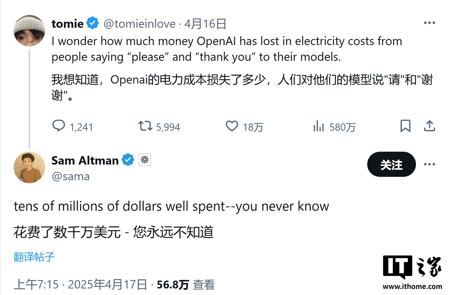 许多人在与聊天机器人互动时会说“请”和“谢谢”,对于这些礼貌用语,OpenAI 首席执行官山姆・奥尔特曼(Sam Altman)透露,每年会耗费数千万美元的计算费用。
