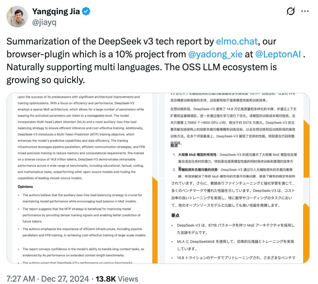 贾扬清还积极对外分享最新的大模型进展思考。比如 DeepSeek 爆火后,贾扬清分析称,它的成功更多体现了纯粹的智慧与务实:在计算资源和人力有限的前提下,通过聪明的研究方法,产出最好的成果。这与当年 Alex Krizhevsky 在只有两块 GPU 的情况下造出 AlexNet 模型一样,靠的不是超大规模集群,而是扎实的能力。
