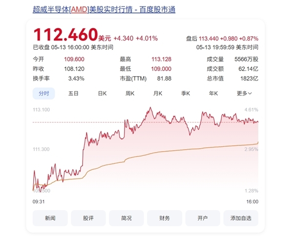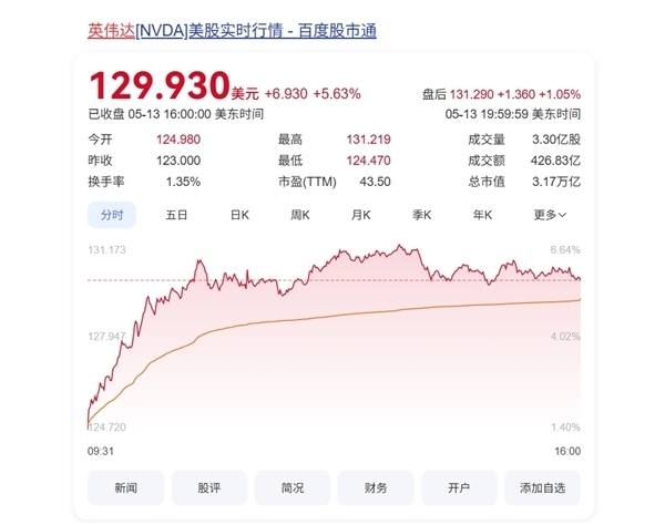 受此消息刺激,NVIDIA、AMD股价双双上涨。美东时间13日收盘,NVIDIA收涨5.63%,市值重回3.17万亿美元。