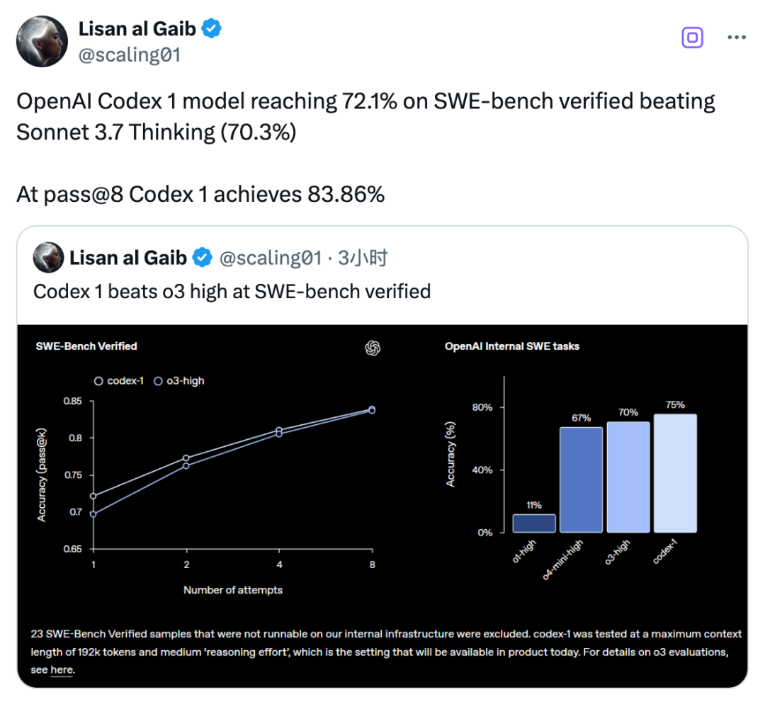 基准测试结果显示,codex-1 在 SWE-Bench 的得分为 72.1%,纸面参数优于 Claude 3.7 以及 o3-high。