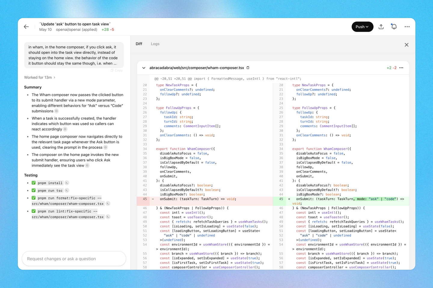 Codex 的每一次会话都在独立的云容器中运行,预加载相关代码库,确保环境隔离。AI 智能体能读取和修改文件、运行测试、执行 linters 或类型检查器等命令,并记录执行结果。