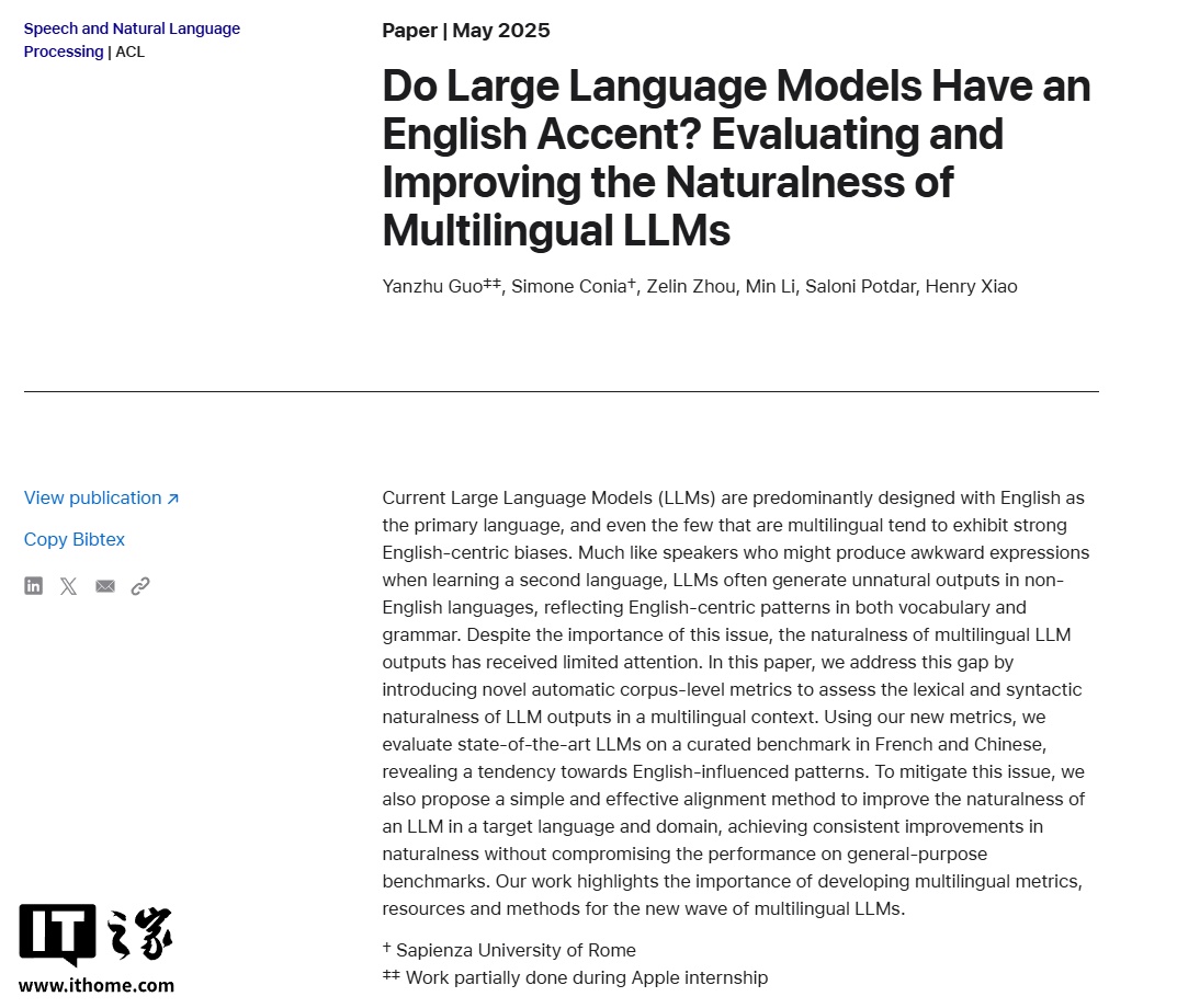 IT之家 5 月 17 日消息,苹果与多国高校及研究院联合发布最新成果,揭示了大语言模型存在的“英语思维定式”问题,并提出创新解决方案。IT之家注意到,科研人员中不乏中国学者的存在。