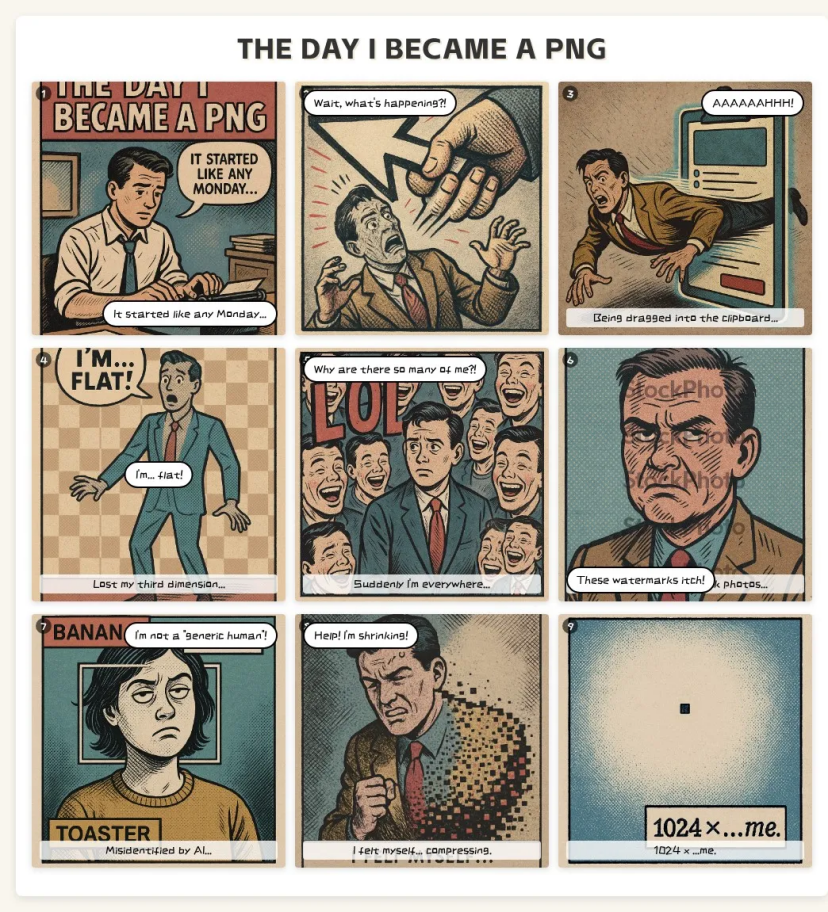 prompt:'' Create a 9-panel comic strip titled “The Day I Became a PNG.”