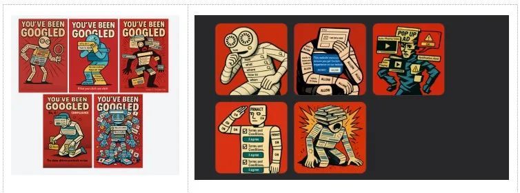 有的角色全身是 cookie 同意按钮,有的是由 loading 圈组成的脸,情绪也精准贴题,羞耻、顺从、信息过载。