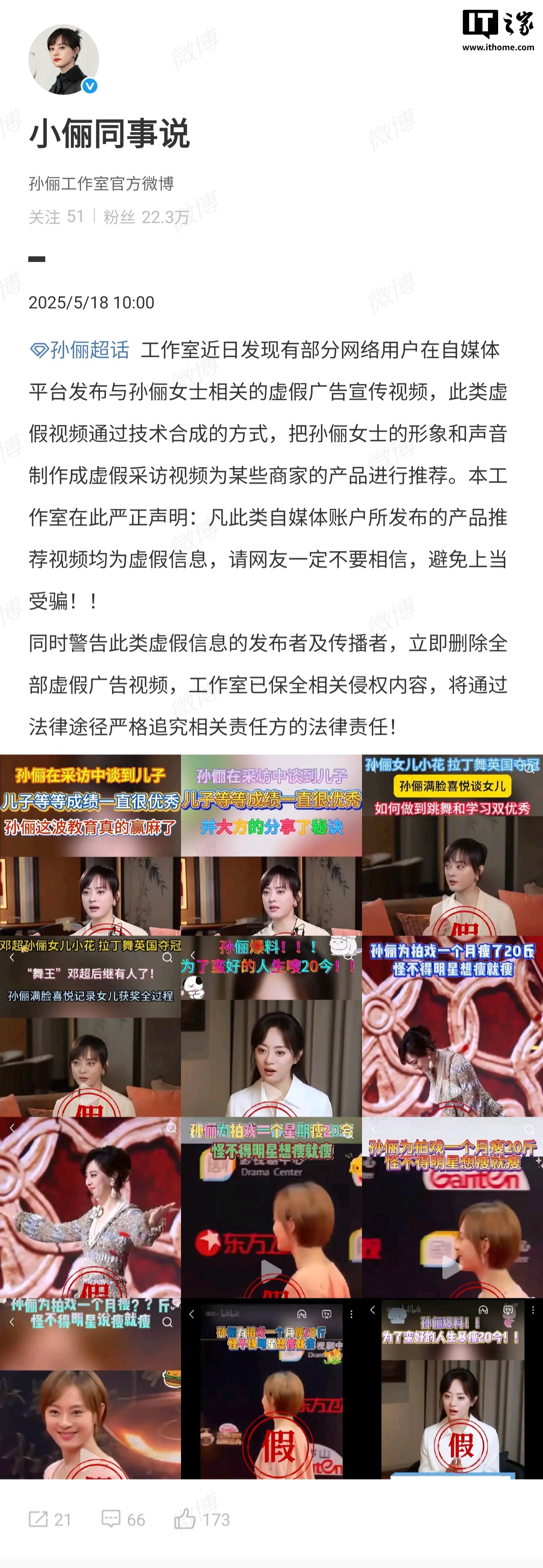 IT之家 5 月 18 日消息,演员孙俪、邓超工作室今日发文打假 AI 虚假广告,“近日发现有部分网络用户在自媒体平台发布与孙俪女士 / 邓超先生相关的虚假广告宣传视频,此类虚假视频通过技术合成的方式,把孙俪女士 / 邓超先生的形象和声音制作成虚假采访视频为某些商家的产品进行推荐。”