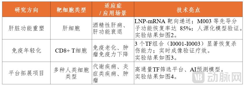 2024年技术实现了关键性突破。研究团队在不改变细胞类型特性的前提下,成功实现了细胞"返老还童"。为支撑技术的进一步发展与转化,公司在同年完成对“核心发现引擎”的平台升级:首先,核心发现引擎的筛选效率实现10倍提升;其次,月度验证数据量达到2023年的15倍;再次,团队累计测试的转录因子组合数量已超过文献记载总量的500倍,其中多个"明星组合"展现出显著恢复细胞功能的潜力,动物实验进一步验证了这些组合在体内的功能恢复潜力。