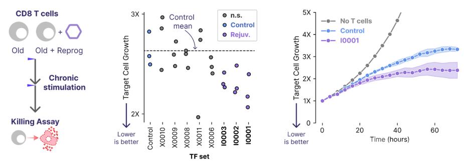 图3:(左)用重编程有效载荷 mRNA 处理旧细胞,然后按上述方式在杀伤测定中进行测试。(中)NewLimit的三种重编程有效载荷 (I0001-I0003) 可恢复老年 CD8 T 细胞的年轻杀伤活性。(右)放大单个生长曲线,I0001 处理的细胞在杀死靶细胞方面更有效,类似于年轻的 CD8 T 细胞。(图片来源:NewLimit官网)