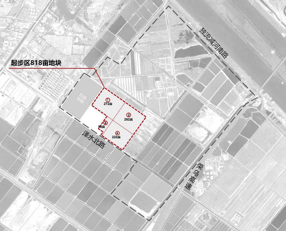 其中818亩起步区为重点区域,毗邻天津石油职业技术学院,共包含四个街区:1号街区272亩,2号街区262亩,3号街区56亩,4号街区228亩。此范围进行概念性城市设计。