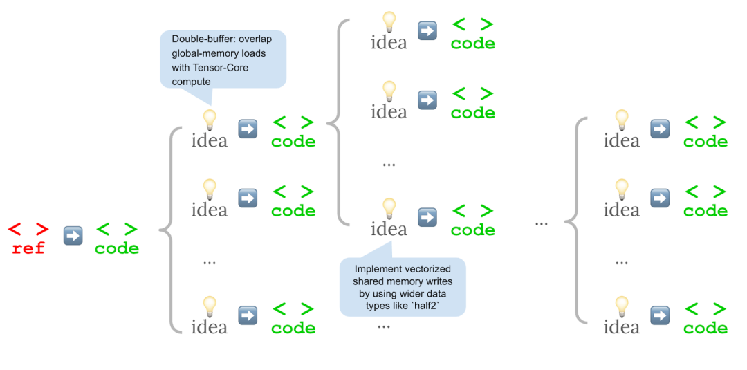 他们不再于每一步直接生成新的内核,而是以先前尝试过的思路为条件,用自然语言生成优化思路,随后将这些思路具化为新的代码变体。