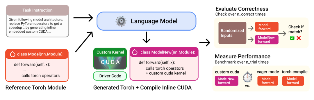 具体来说,给定一段torch代码,LLM会编写自定义内核来替换原有的torch算子,目标是实现加速。