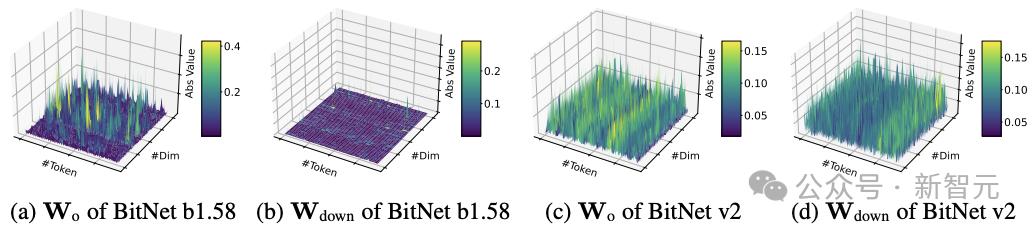 图3:采用8比特激活值时,BitNet b1.58与BitNet v2在前馈网络Wdown层和注意力机制Wo层的激活值分布对比。