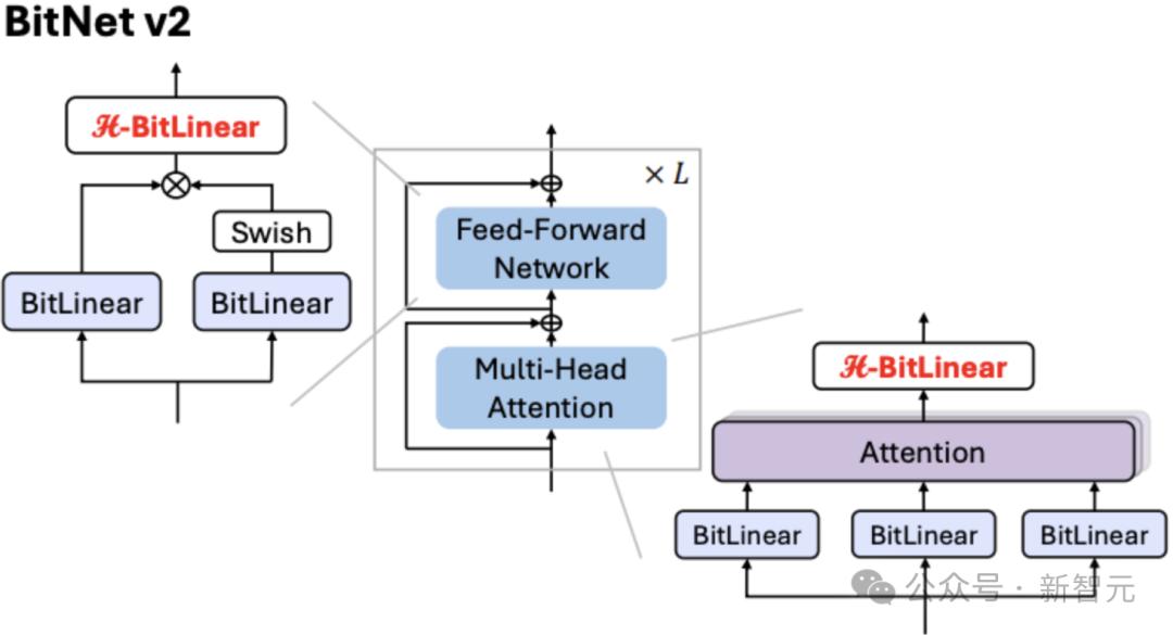 与先前的BitNet相比,BitNet v2在注意力模块的输出投影Wo和前馈网络(FFN)的下投影Wdown中,引入了H-BitLinear模块,以专门处理中间状态中出现的异常通道(outlier channels)。