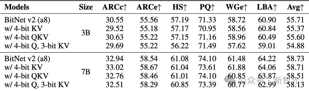表2:BitNet v2在终端任务上的零样本准确率,其中激活使用8位,而QKV状态的位宽则有所不同。