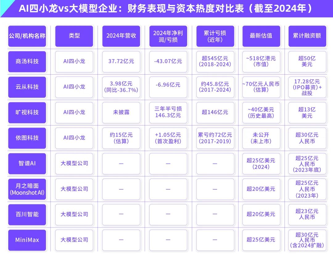 估值动辄数十亿美元,但商业化路径尚未明确。2023年以来,智谱AI、月之暗面、百川智能、MiniMax等“新四小龙”估值均已超20亿美元,融资节奏堪比当年的AI四小龙。