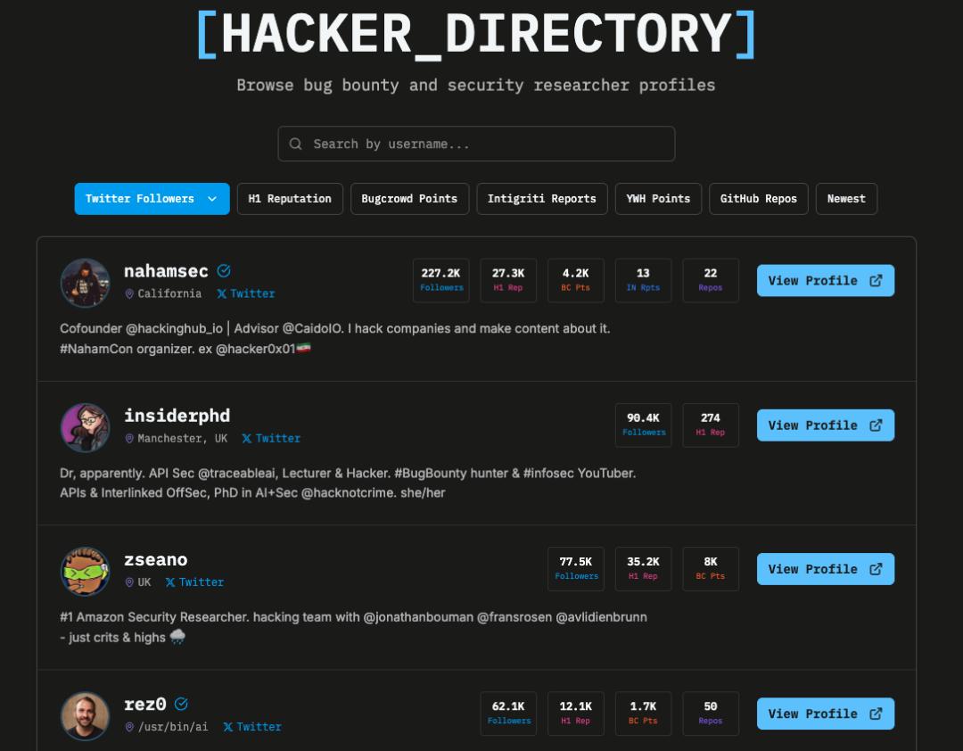 Harley Kimball 做的这个应用,说白了就是一个把各大安全研究员平台(像 HackerOne、Bugcrowd、GitHub 这些)上的公开资料集中到一块的网站。用户注册登录之后,可以一眼看到各路白帽黑客的公开档案。