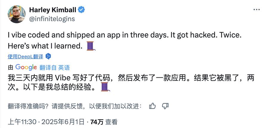 这不,一位开发者 Harley Kimball 就在 X 上分享了自己使用“氛围编码”而后“掉坑”的经历。他用了三天不到的时间开发并上线了一个聚合网站的应用,殊不知,却在随后短短两天内接连遭遇两次安全漏洞攻击。