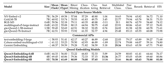 根据测试数据显示,在多语言文本表征基准测试中,Qwen3 Embedding的性能非常出色。其中,8B参数以70.58的高分排名第一,超越了众多商业API服务,例如,谷歌的Gemini-Embedding。