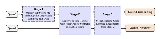 在无监督预训练阶段,研究人员利用Qwen3基础模型的文本生成能力,合成大规模的弱监督训练数据。这些数据涵盖了多种任务类型、语言和领域,为模型提供了广泛的学习素材。