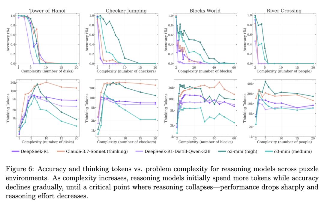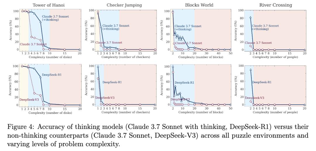 然而,当问题复杂度继续增加并超过某个临界点时,无论是推理模型还是标准模型都会经历完全的性能崩溃,准确率直线下降至零。