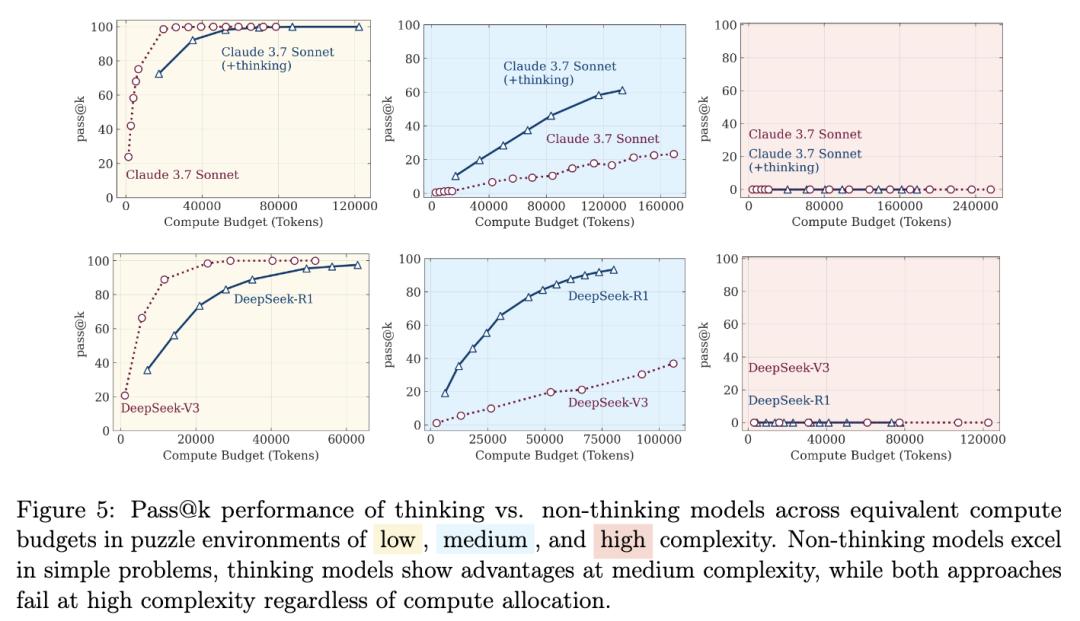 以下是在低、中、高复杂度的谜题环境中,思考模型与非思考模型在同等计算预算下的pass@k性能表现:
