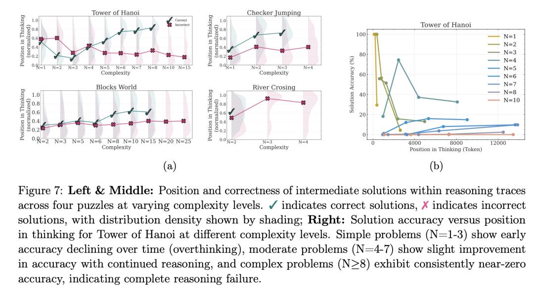 然而,实验结果显示,模型的失败点几乎没有改变,它们仍然无法突破任务复杂性限制,性能没有提升,且观察到的崩溃仍发生在大致相同的临界点。