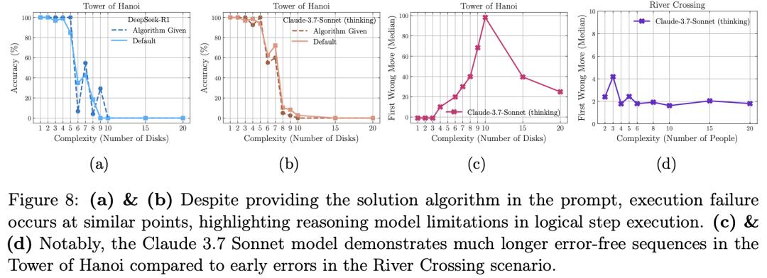 团队认为这一点非常值得注意,因为寻找和设计解决方案本应比单纯执行给定算法需要更多的计算。这进一步凸显了推理模型在验证和遵循逻辑步骤解决问题方面的局限性,表明需要进一步研究以理解此类模型的符号操作能力。