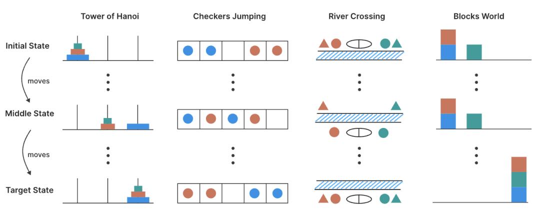 巧妙之处在于,四类谜题的难度可以精确控制,同时保持逻辑结构的一致性,研究者能够系统观察模型在不同复杂度下的行为变化,比如生成的每一步移动是否正确、是否重复试错。