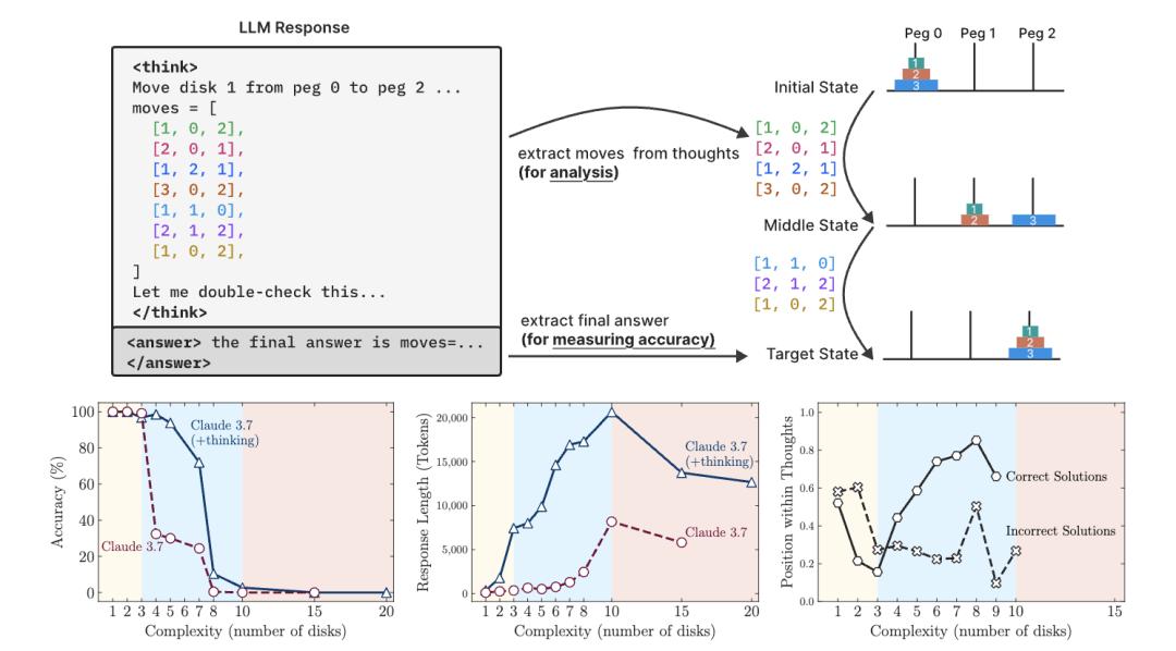 苹果团队认为现有评估主要集中在既定的数学和编码基准上,看模型最终答案是否正确,但可能存在数据污染(模型训练时见过类似题目)。并且,这些评估大都缺乏对“思考过程质量”的分析,比如中间步骤是否逻辑一致、是否绕弯路等。