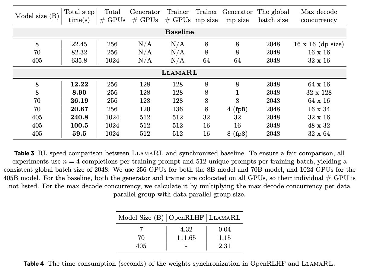 在实际测试中,LlamaRL 在 8B、70B 和 405B 模型上分别将训练时间缩短至 8.90 秒、20.67 秒和 59.5 秒,速度提升最高达 10.7 倍。