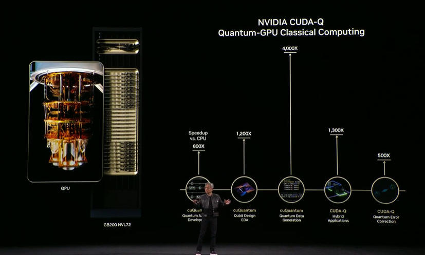 除了AI,黄仁勋还宣布英伟达在量子计算领域取得了关键进展,他认为该领域正迎来一个“拐点”。英伟达的策略并非独立发展量子计算机,而是将量子处理器(QPU)与GPU连接起来,利用GPU强大的计算能力进行预处理和纠错等密集型计算任务。他宣布,英伟达的整个cuQuantum量子计算算法堆栈,现已能在Grace Blackwell上加速运行。