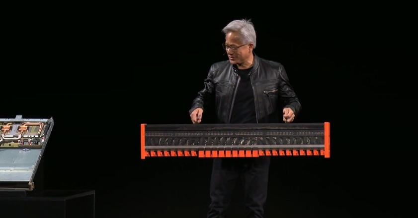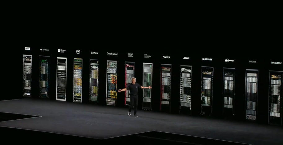 为支撑AI工厂的庞大算力需求,黄仁勋详细介绍了英伟达的新一代架构Blackwell。他将GB200系统形容为一台专为思考而生的“思维机器”,其设计初衷就是为了应对AI模型日益增长的“推理”需求。该系统通过全新的NVLink技术实现内部连接,其背板带宽高达惊人的130TB每秒,超过了全球互联网的峰值流量。黄仁勋指出,正是这种架构上的巨大飞跃,使得AI的思考速度和处理能力得以实现数十倍的代际性能提升。