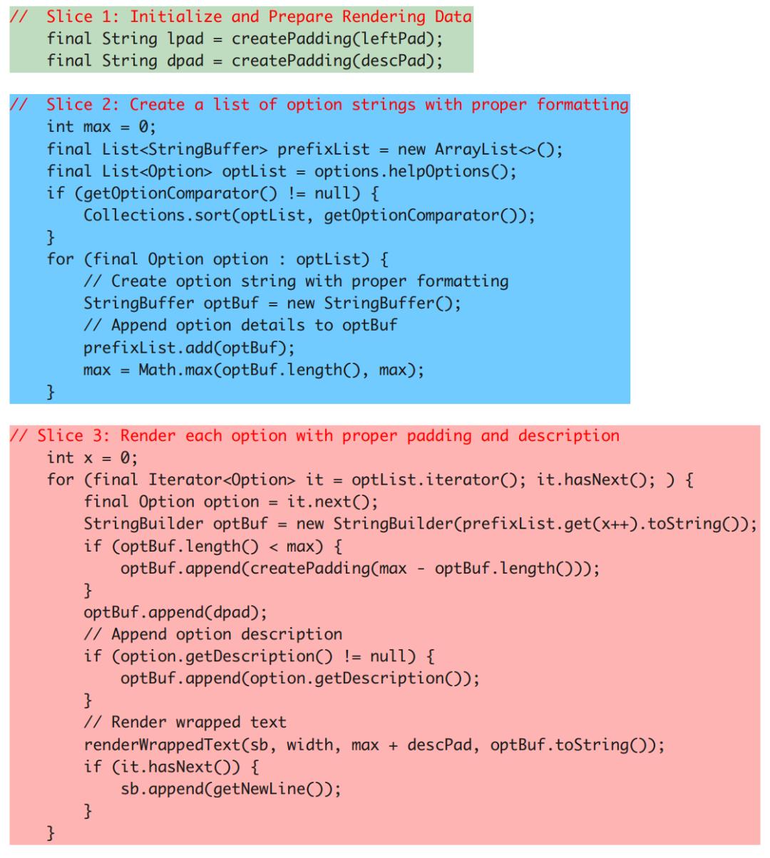 程序分片指将一个程序依据语义划分为若干解决问题的阶段。程序是对一个问题解决方案的形式化表述。一个问题解决方案通常包含多个步骤,每个步骤对应着程序中的一片(slice)代码。如下图所示,一个色块对应着一片代码,也对应着一个问题解决的步骤。