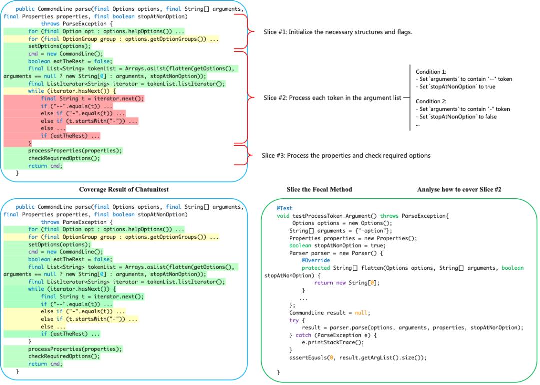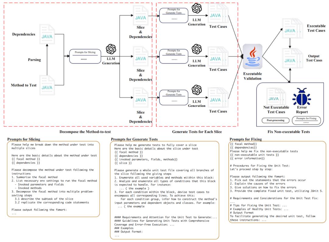 然而,大模型自身无力为复杂待测函数(环复杂度大于 10)生成高覆盖率的测试样例集。 为了解决该痛点,北京大学李戈教授团队提出一种全新的提升测试用例覆盖率的方法,该方法借助程序分片思想(Method Slicing),将复杂待测函数依据语义拆解为若干简单片段,进而让大模型为各个简单片段分别生成测试样例。 生成单个测试样例时,大模型只需分析原待测函数的一个片段,分析难度减小,生成覆盖该片段的单元测试难度随之减小。 由此推广,提升整体测试样例集代码覆盖率。