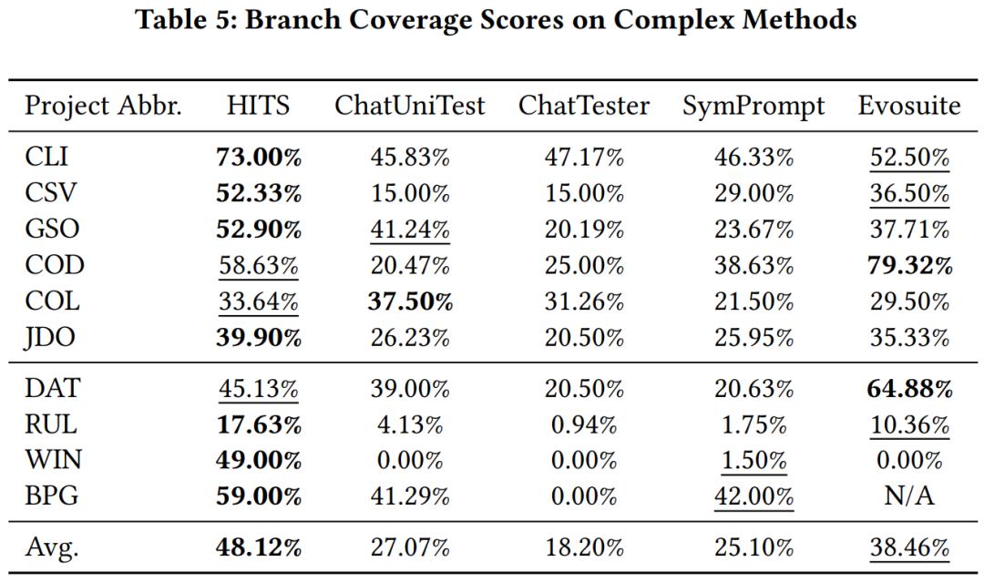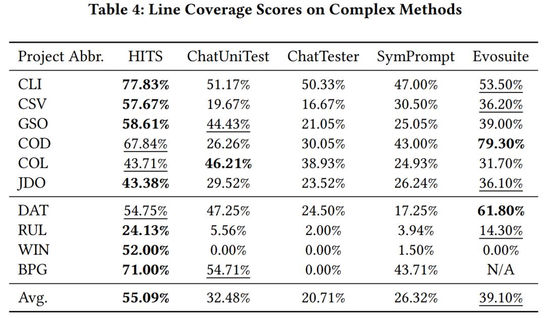 研究团队使用 gpt-3.5-turbo 作为 HITS 调用的大模型,分别在大模型学习过和未学习过的 Java 项目中的复杂函数(环复杂度大于 10)上对比 HITS,其他基于大模型的单元测试方法和 evosuite 的代码覆盖率。实验结果显示 HITS 相较于被比较的诸方法有较明显的性能提升。