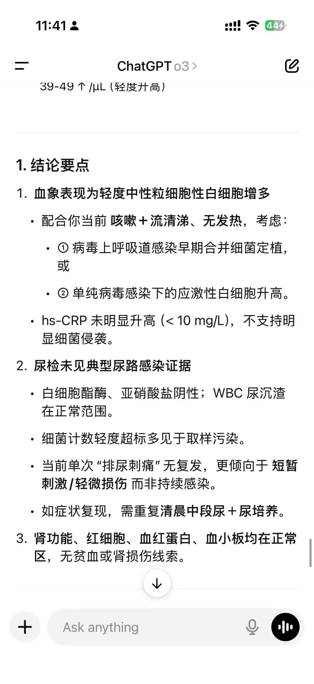 如果是往日,我得了感冒,自己又不是医学从业者,我会去挂个号门诊开药,而这一次通过提示词描述,让AI告诉自己当前处于感冒什么阶段。并且在检验报告给出之后,AI进行了解读,说明当前了情况,是处于轻度的上呼吸道感染,而且是细菌感染类型。
