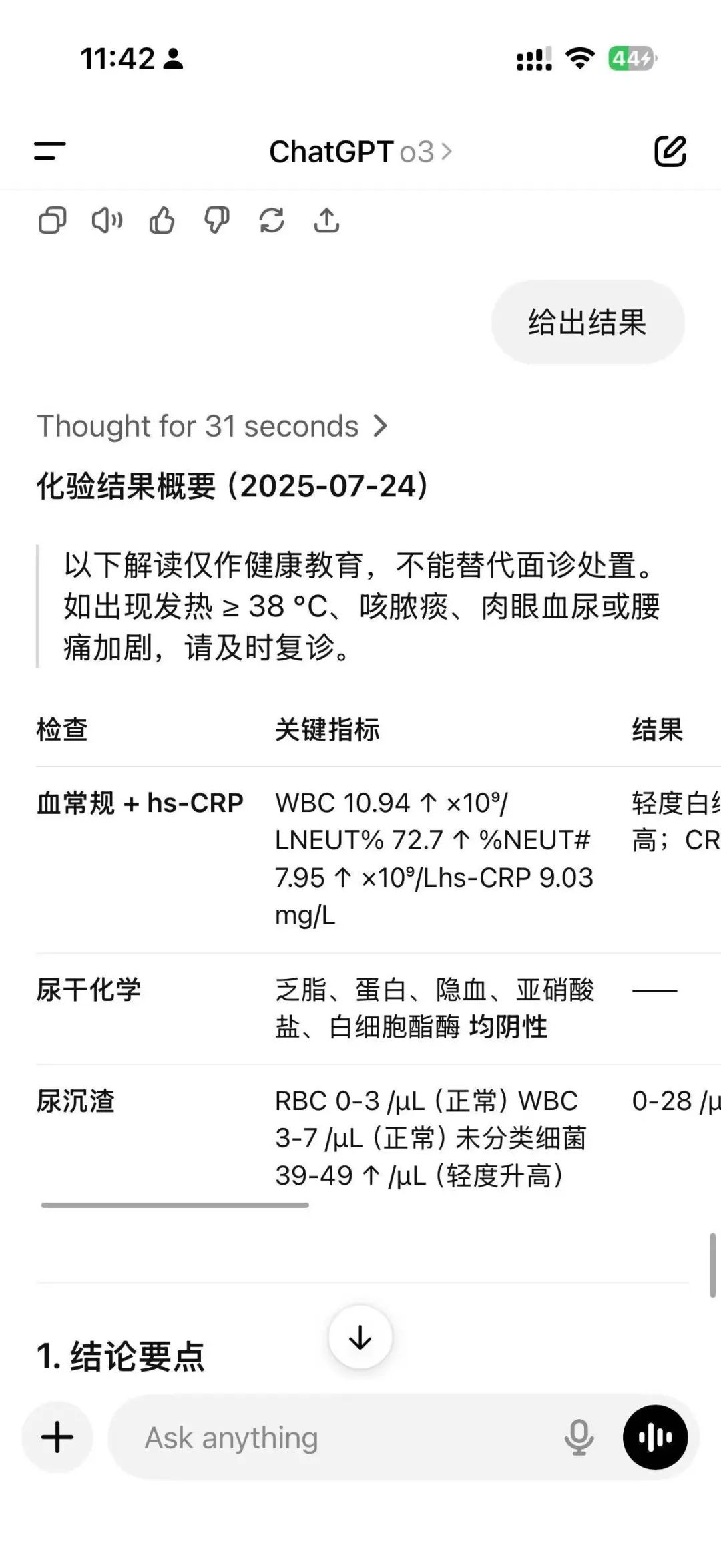 因为现在我使用的AI模型是支持多模态的,所以上传化验结果之后,马上就得到了报告的解读。并且给了我当前疾病的诊断结论