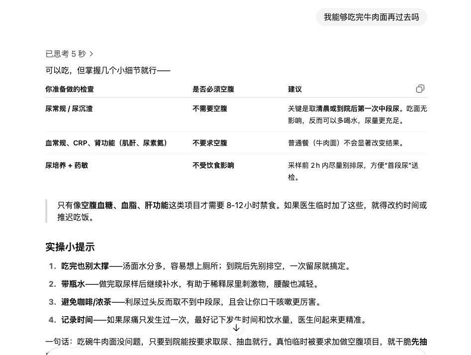 这里有一个题外话,我还针对检测是否要空腹做了提问,在打消了空腹检查的疑惑之后,我决定吃碗面条再去做抽查检查。