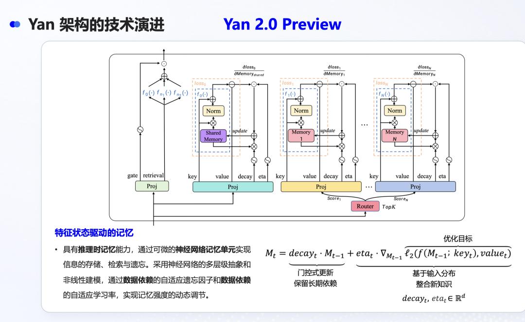 而在今年 WAIC 推出的 Yan 2.0 Preview 仅 30 亿参数,已经能做到多模态,并在本地实现真正的「记忆」:模型可动态调整权重,长期保留并更新用户偏好。