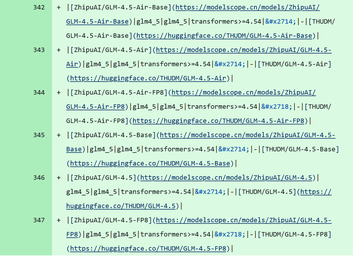 根据 commit 上显示的代码,GLM-4.5 系列模型预估会有 GLM-4.5(355B-A32B)和 GLM-4.5-Air(106B-A12B)两款模型。