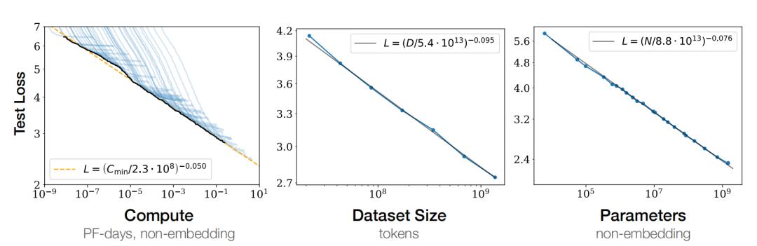 《神经语⾔模型的缩放定律》论文写道,随着模型⼤⼩、数据集⼤⼩和⽤于训练的计算量的增加,语⾔建模性能平稳提升 | 图片来源:OpenAI